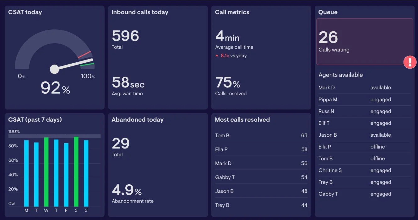 Dashboards zeigen aktuelle Leistungsdaten in ĂĽbersichtlicher Form. Supervisoren und Teamleiter erkennen sofort, wie viele Anrufe aktiv sind, wie lang Wartezeiten ausfallen oder wie stark Teams ausgelastet sind.